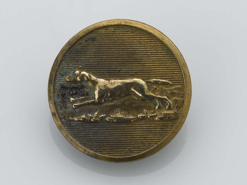 Ronde, platte knoop met jachtvoorstelling van jachthond