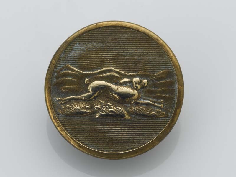 Ronde, platte knoop met jachtvoorstelling van rennend konijn