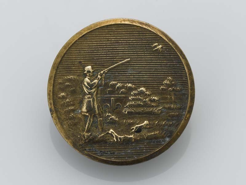 Ronde, platte knoop met jachtvoorstelling van jager in landschap die een vogel schiet
