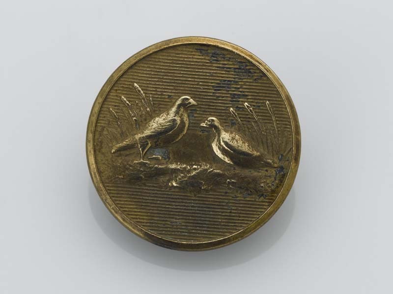 Ronde, platte knoop met jachtvoorstelling van twee duiven