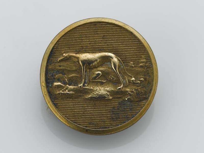 Ronde, platte knoop met jachtvoorstelling van hazewindhond