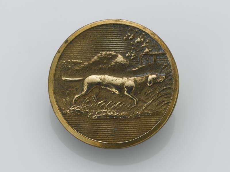 Ronde, platte knoop met jachtvoorstelling van sluipende hond