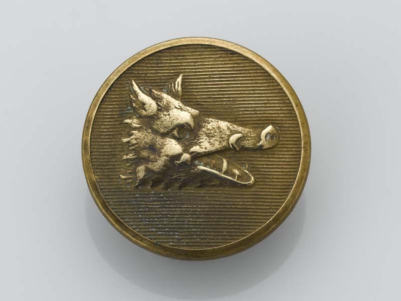 Ronde, platte knoop met jachtvoorstelling van zwijnskop