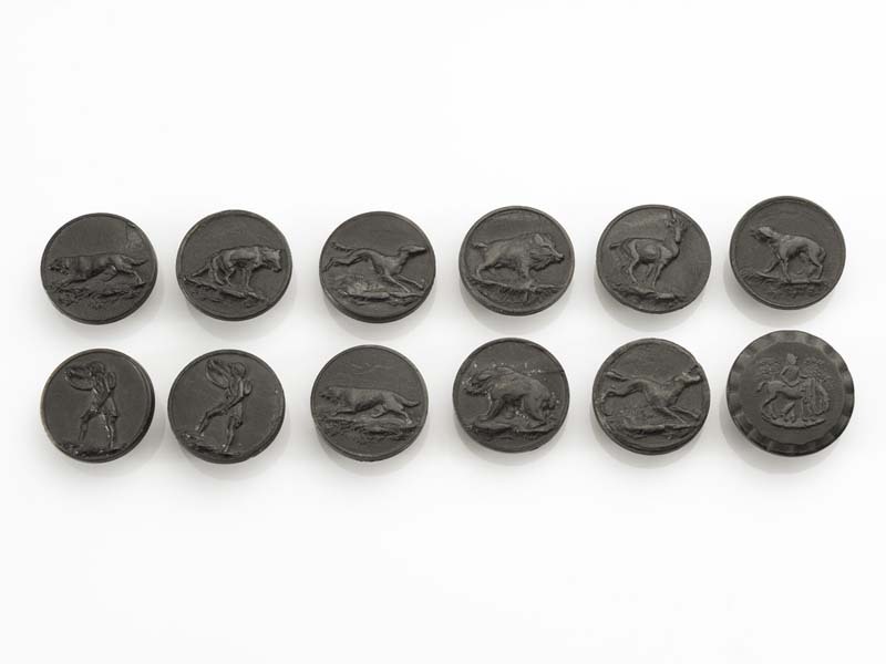 Twaalf ronde, platte knopen van eboniet met diverse voorstellingen