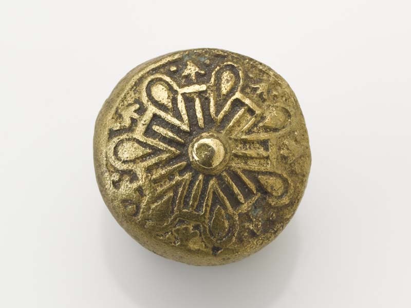 Ronde, bolle knoop met langs de rand een gladde contour en in het hart een verhoogd bolletje