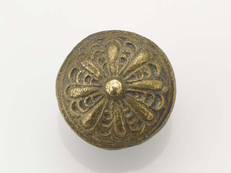 Ronde, bolle knoop met langs de rand een gladde contour, in het centrum een verhoogde cirkel