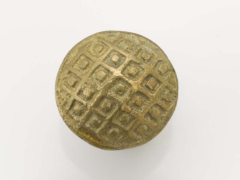 Ronde, bolle knoop met langs de rand een gladde contour, vlak verdeeld in ruiten