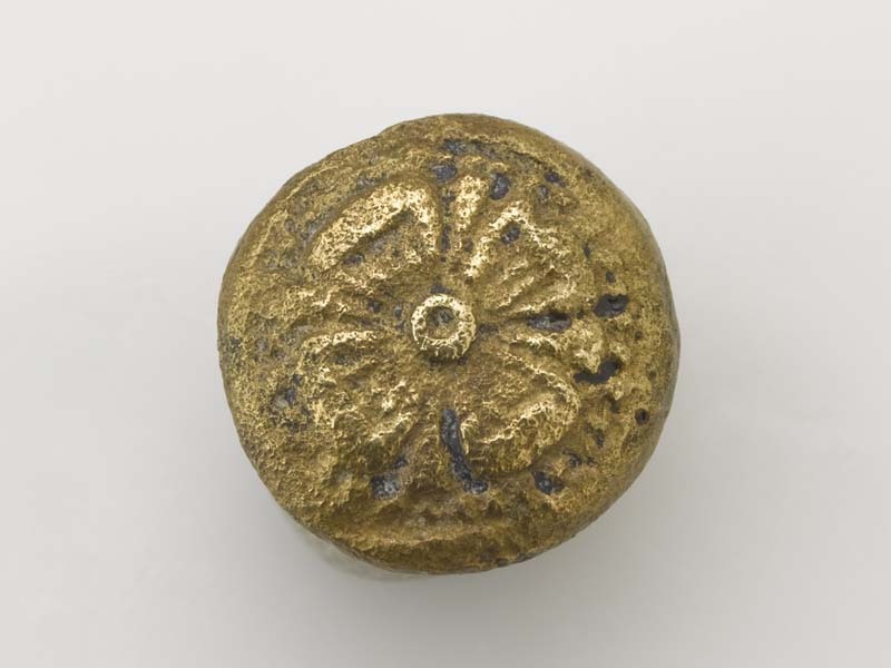 Ronde, bolle knoop met galdde contour en vijfbladig bloempje