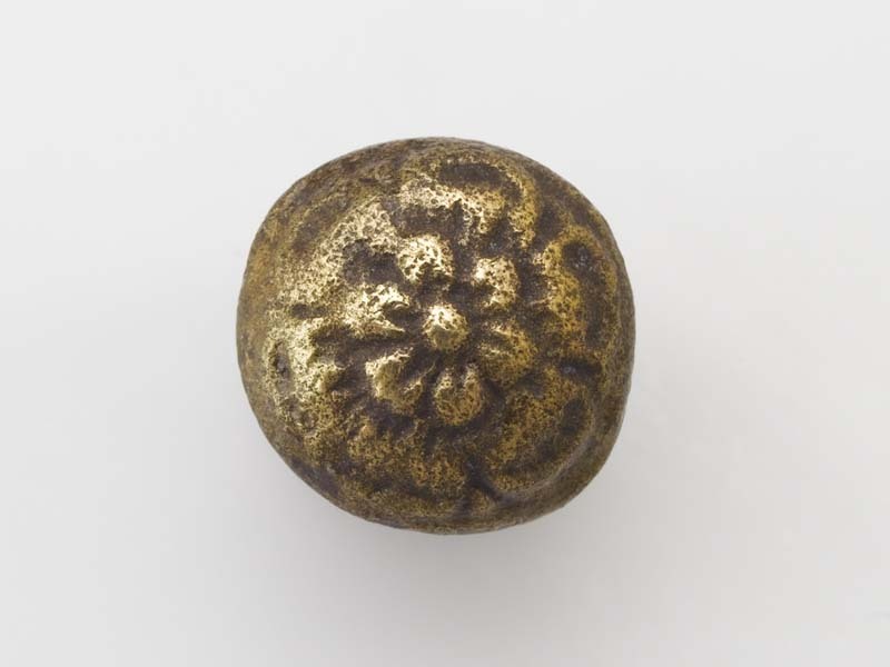 Ronde, bolle knoop met gladde contour en vijfbladig bloempje met hart