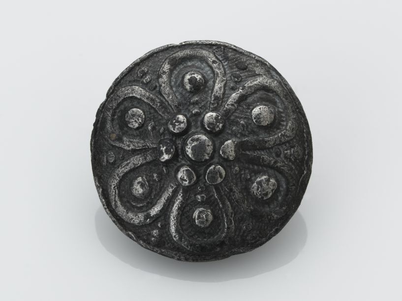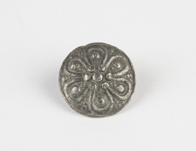 Platte knoop van lood of tin, met bloem versiering