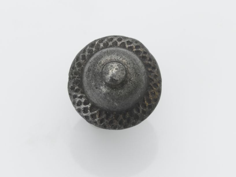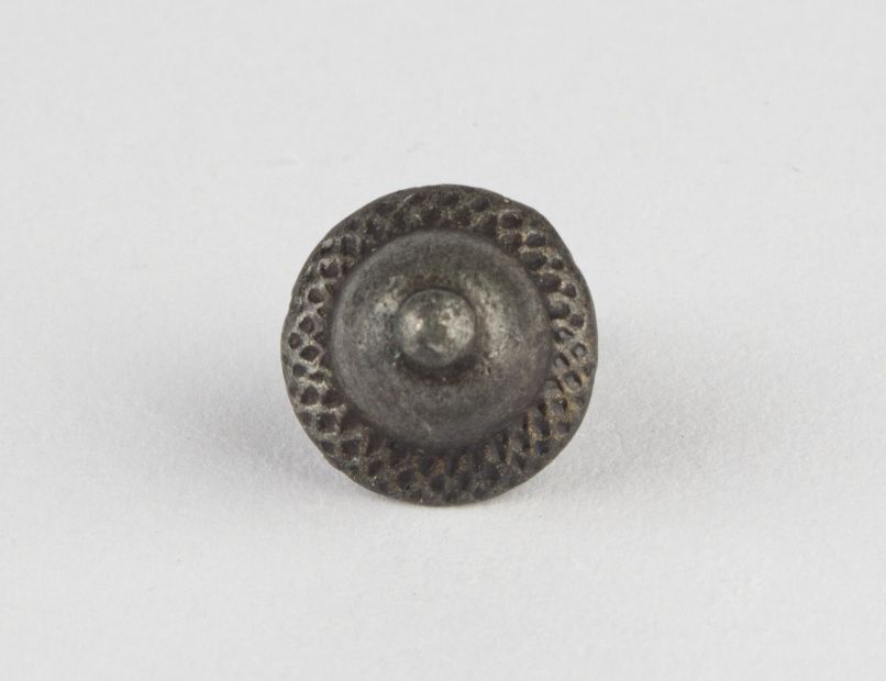 Bolle knoop van lood of tin, met verhoogd hart en relief randje