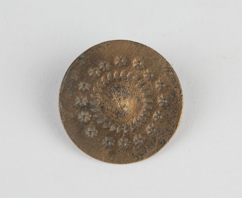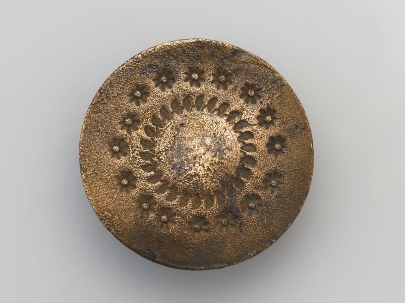 Koperen plaat knoop, met zonnestraal motief en rosetrand