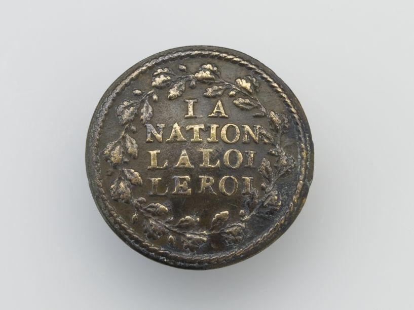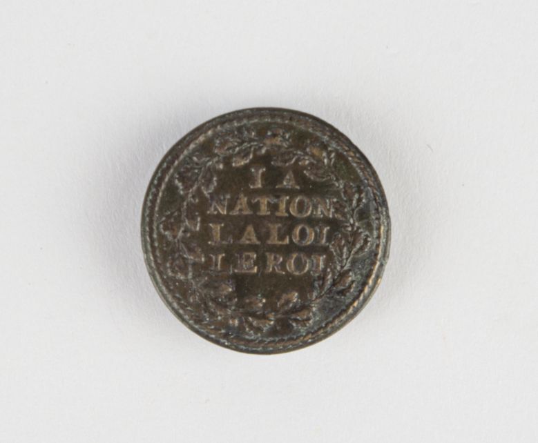 Koperen plaat knoop, met lauwerkrans en opschrift La Nation, La Loi, Le Roi