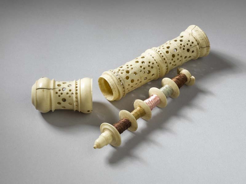 Cylindervormige wit benen garenklosjeskoker met schroefdop, de cylinder versierd met kleine en grote gaatjes, in de koker een spil met vijf klosjes
