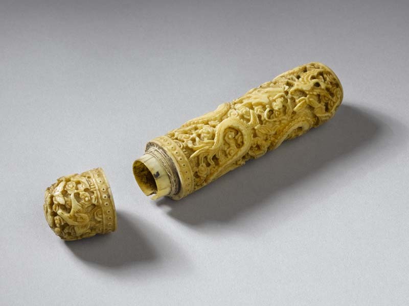 Ivoren cylindervormige koker met schroefdop, de koker besneden met vogels, draken, vlinders, bloemen en bladeren