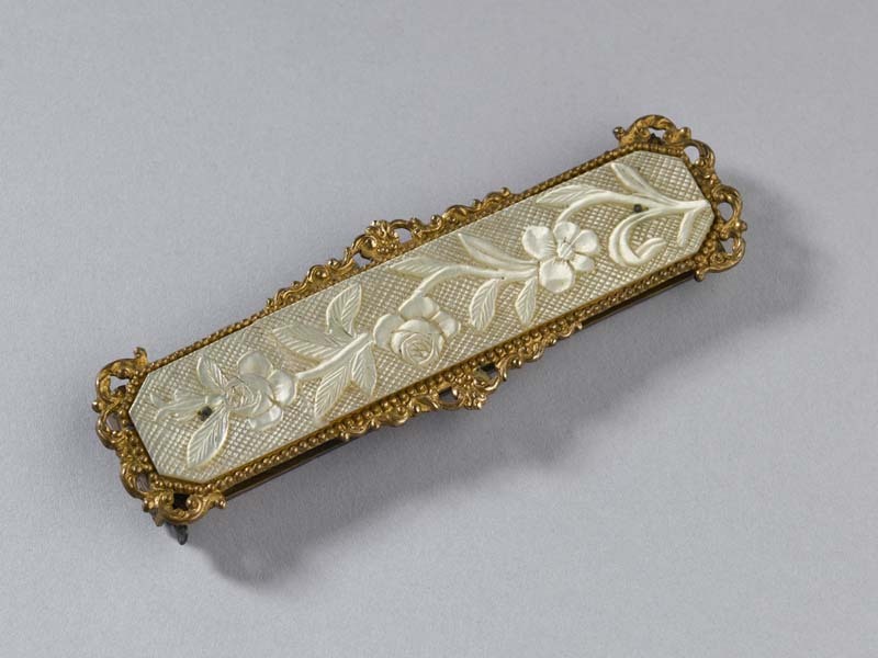 Verguld koperen langwerpig rechthoekige gesp, het gespgedeelte scharnierend verbonden aan de voorplaat, de voorplaat ingelegd met een stuk parelmoer waarop een bloemslinger is gesneden