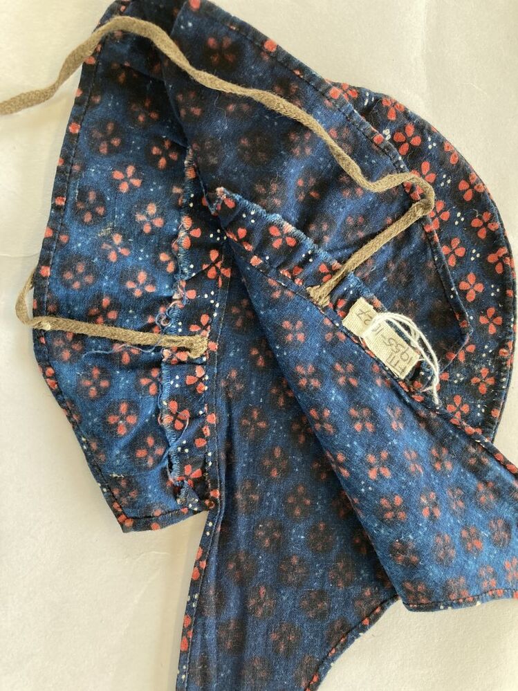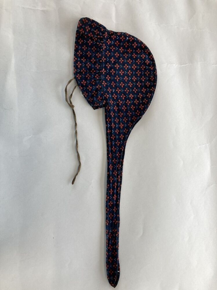 Katoenen kindermutsje met lange banden, donkerblauw met rode bloempjes