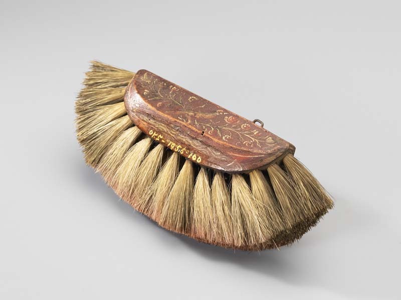 Kledingborstel met houten greep in Hindeloper kleuren beschilderd, rood fond waarop een vogeltje op een bloemtak