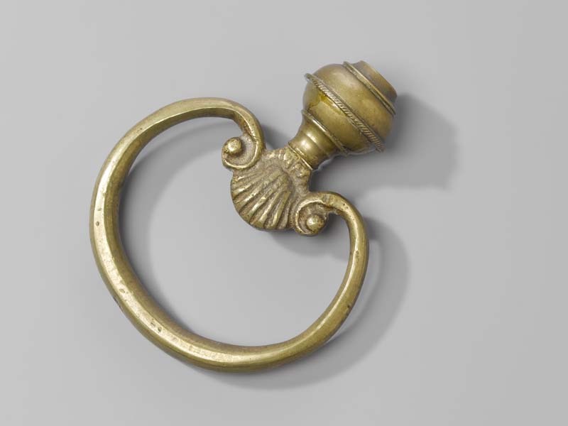 Gegoten geel koperen greep, waarop St. Jacobsschelp