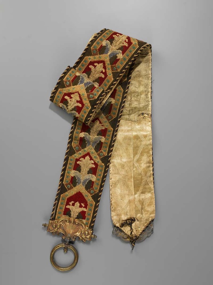 Schellekoord met wollen kruissteekpatroon in diverse kleuren, aan de onderzijde als greep een ring van koperblik, de achterzijde met geborduurde zijde gevoerd