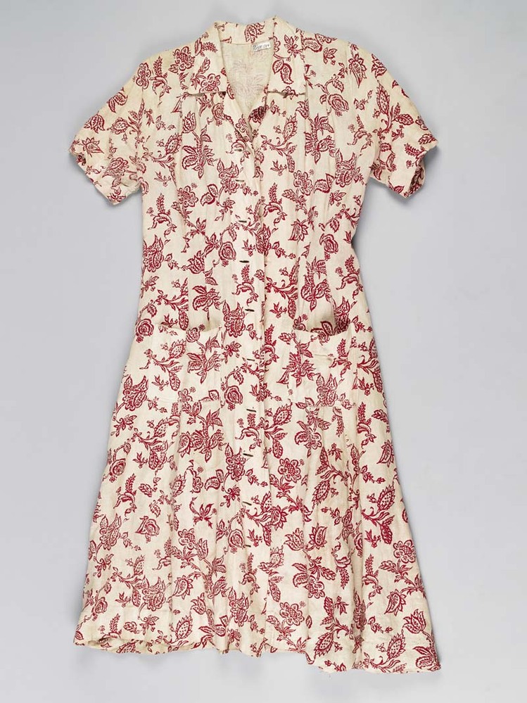 Doorknoopjurk, van grof linnen bedrukt met rode bloemen, met korte mouwtjes, op de voorkant twee opgestikte zakken