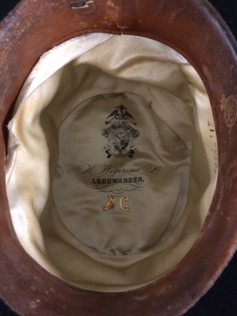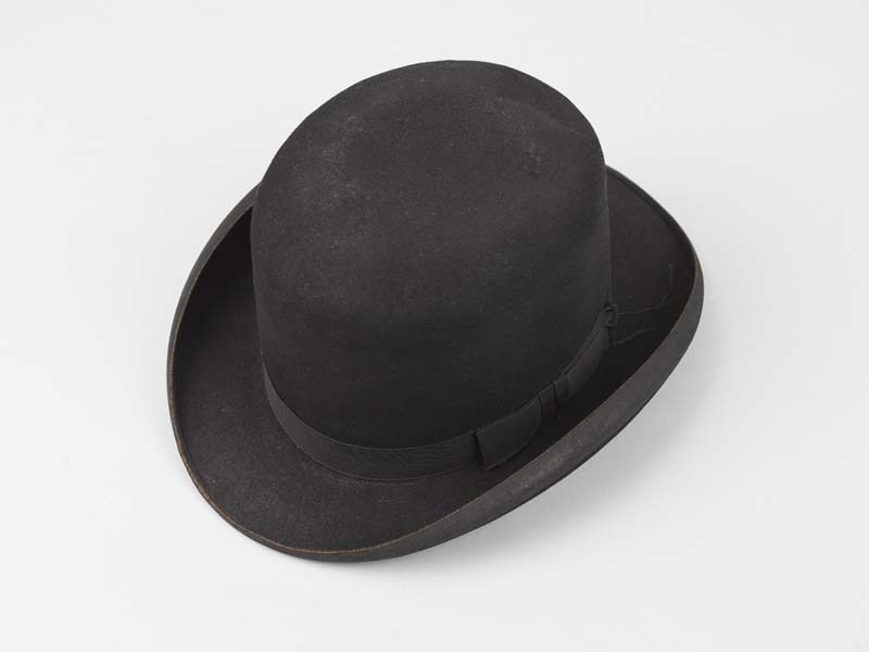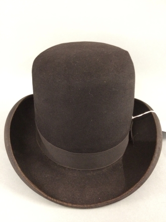 Zwart vilten herenhoed met hoge bol, van binnen witte zijdevoering