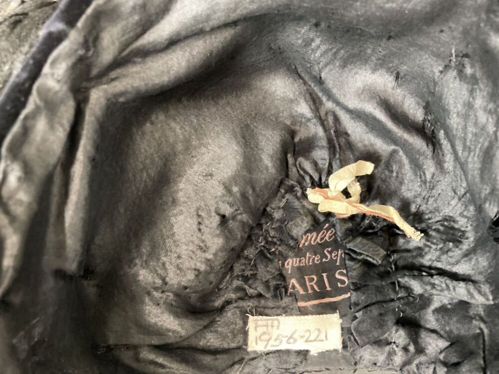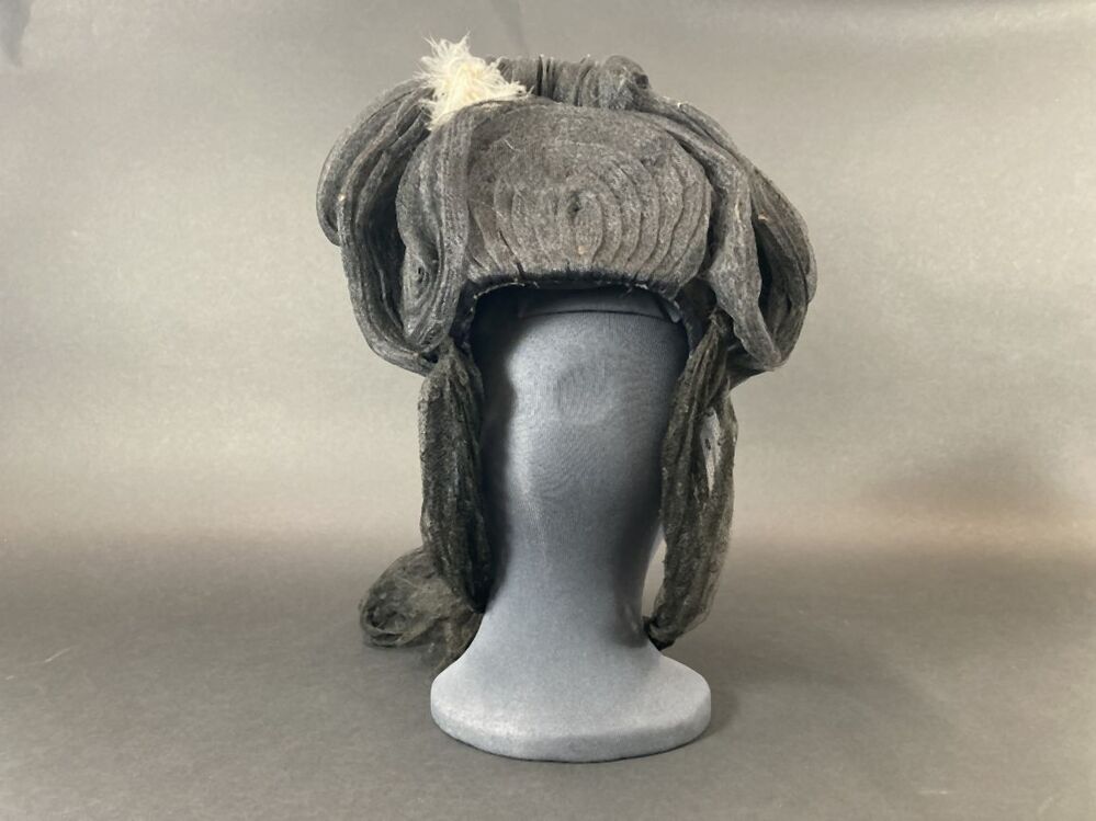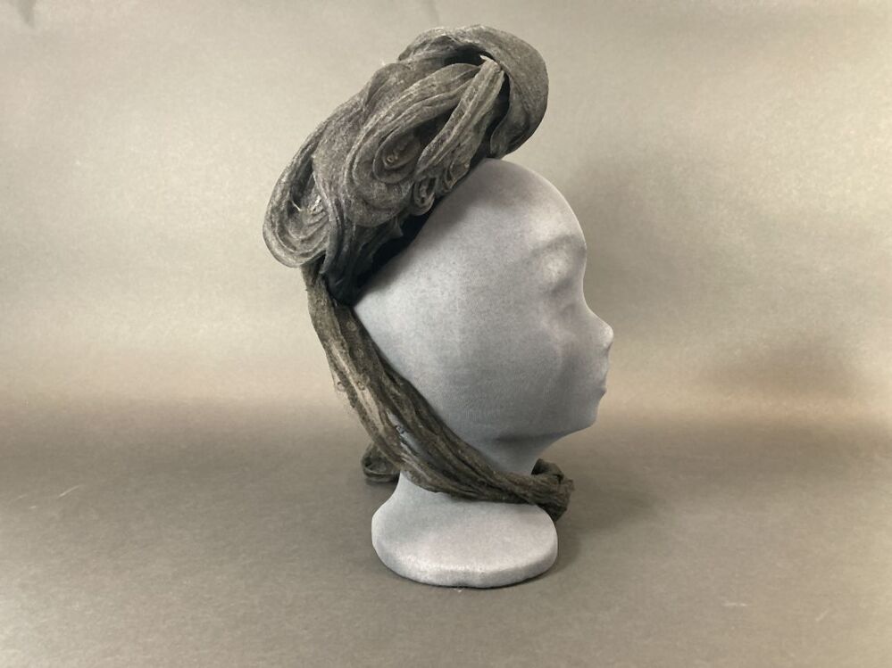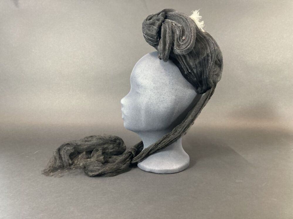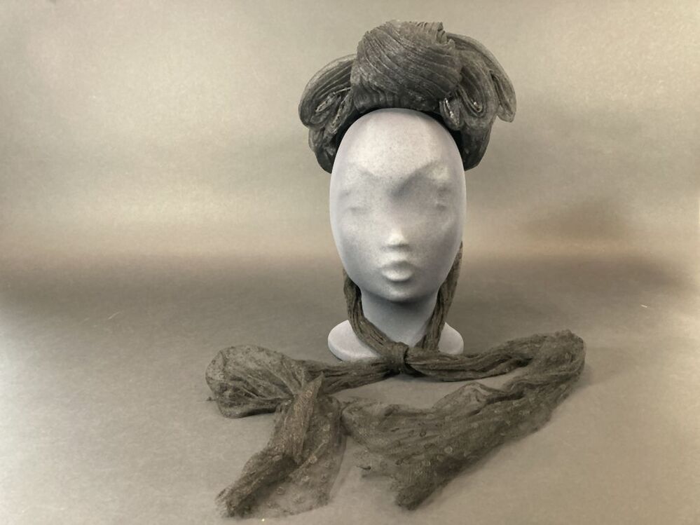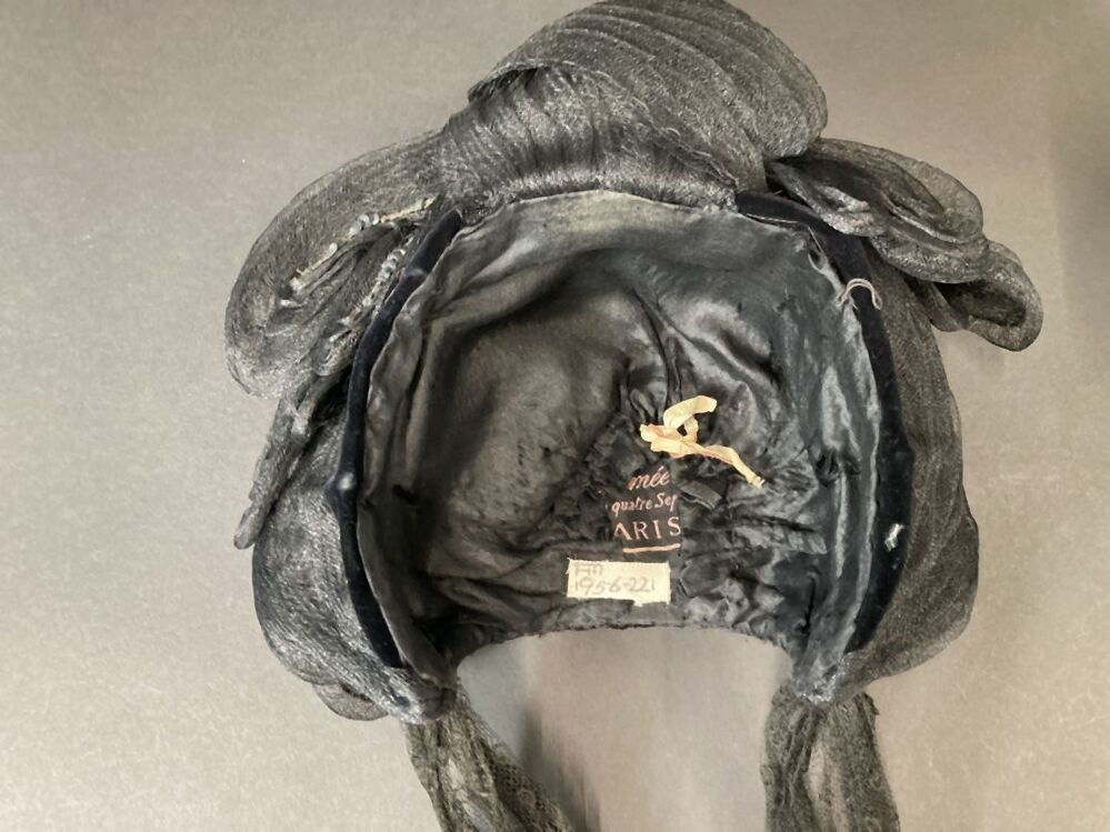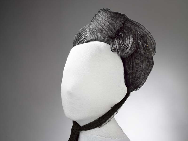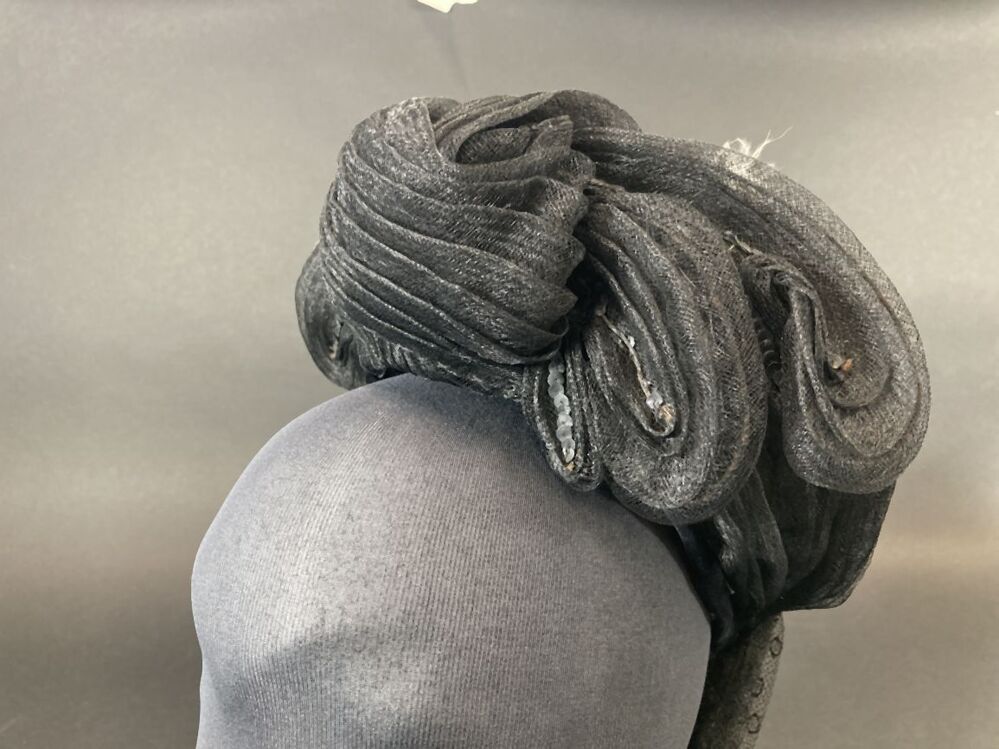 Zwart kypske van zwarte geappliqueerde tule met lange bewerkte tulen keelbanden
