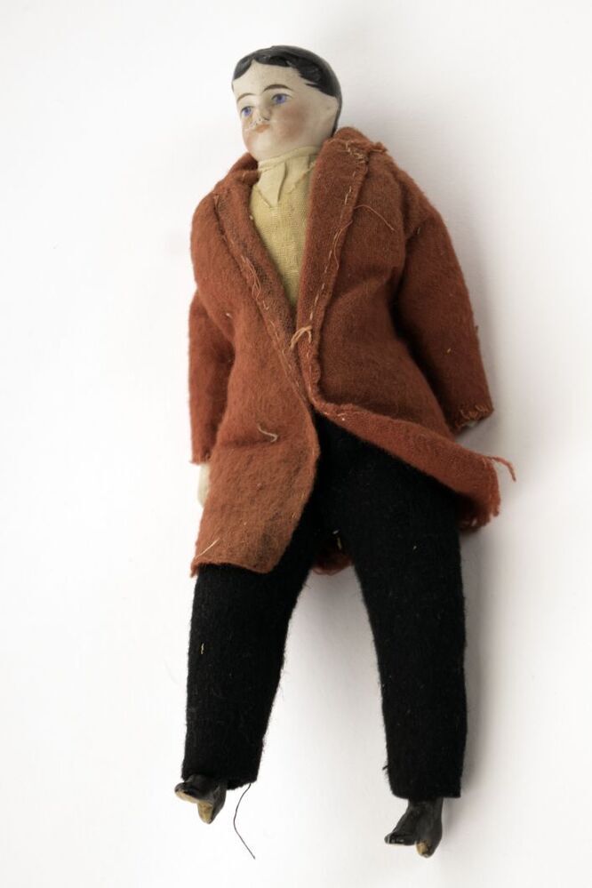 Popje gekleed als man, met biscuit hoofd, met snor, rode jas en zwarte broek