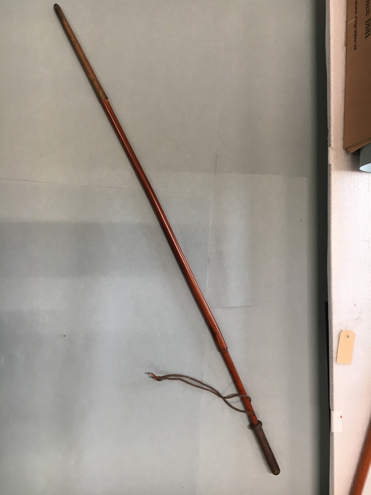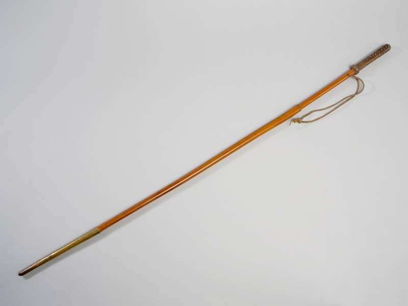 Wandelstok met grote gele koperen bus op het einde, de greep voorzien van gevlochten leer, verder een gevlochten leren koord om aan de pols te hangen