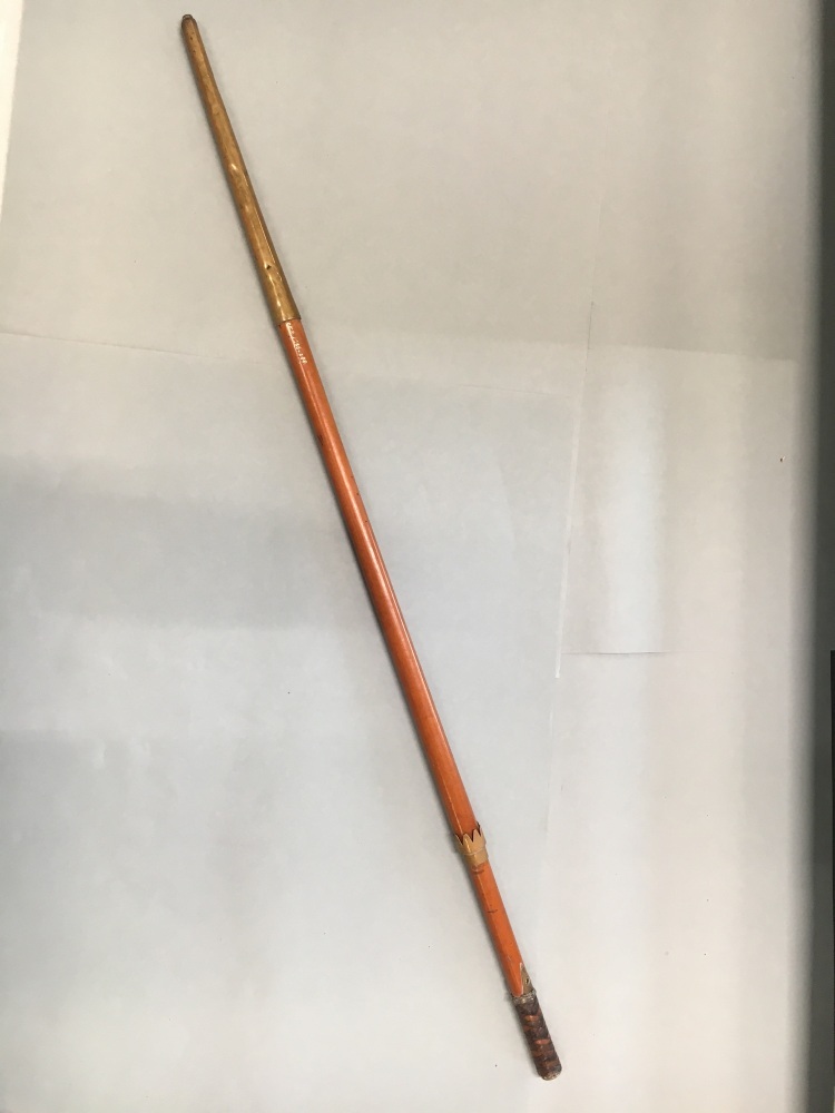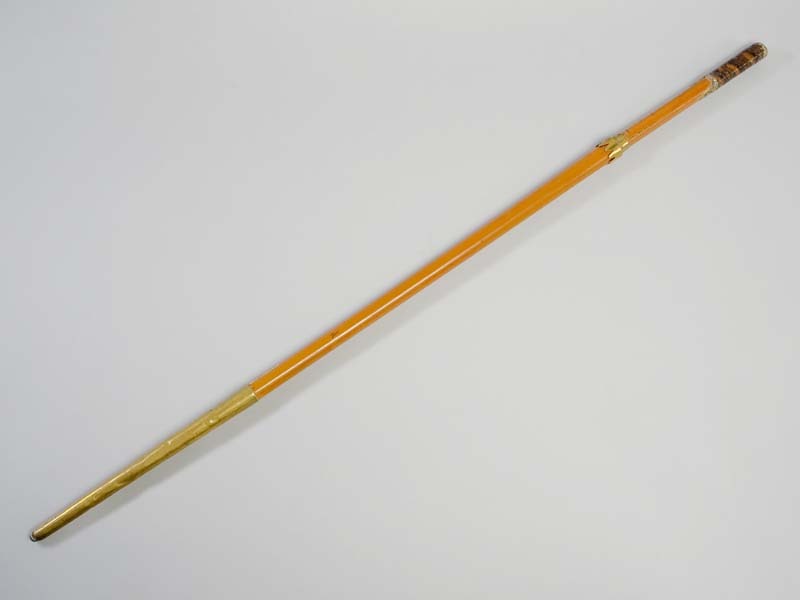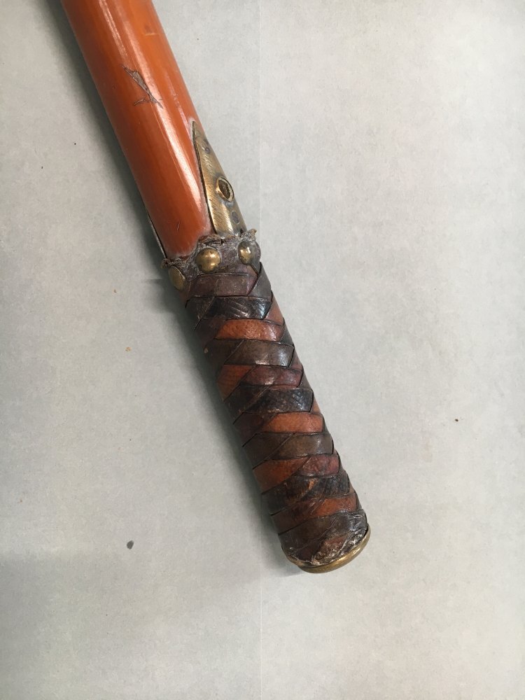 Wandelstok met grote gele koperen bus op het einde, de greep voorzien van gevlochten leer