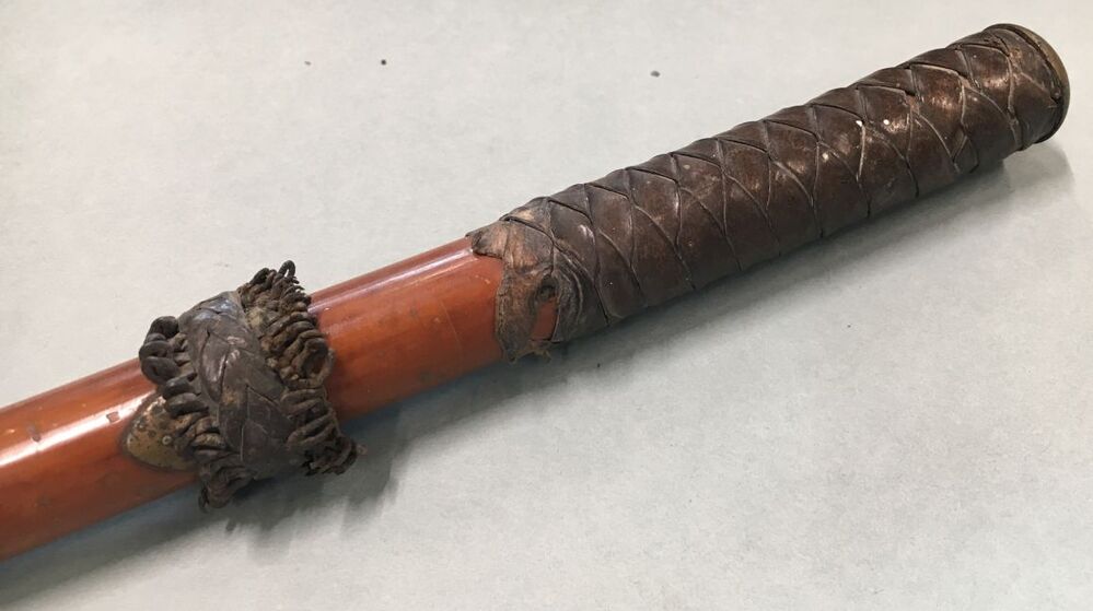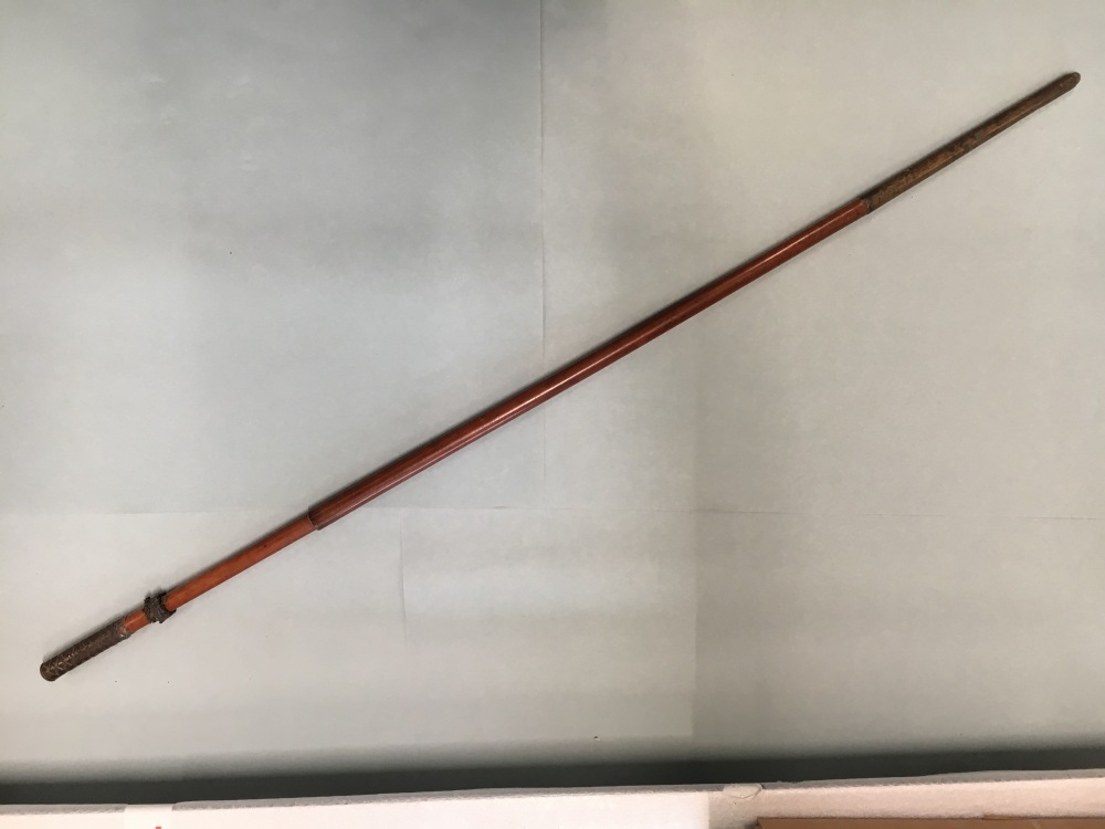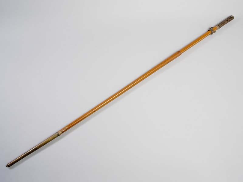 Wandelstok met grote gele koperen bus op het einde, de greep voorzien van gevlochten leer