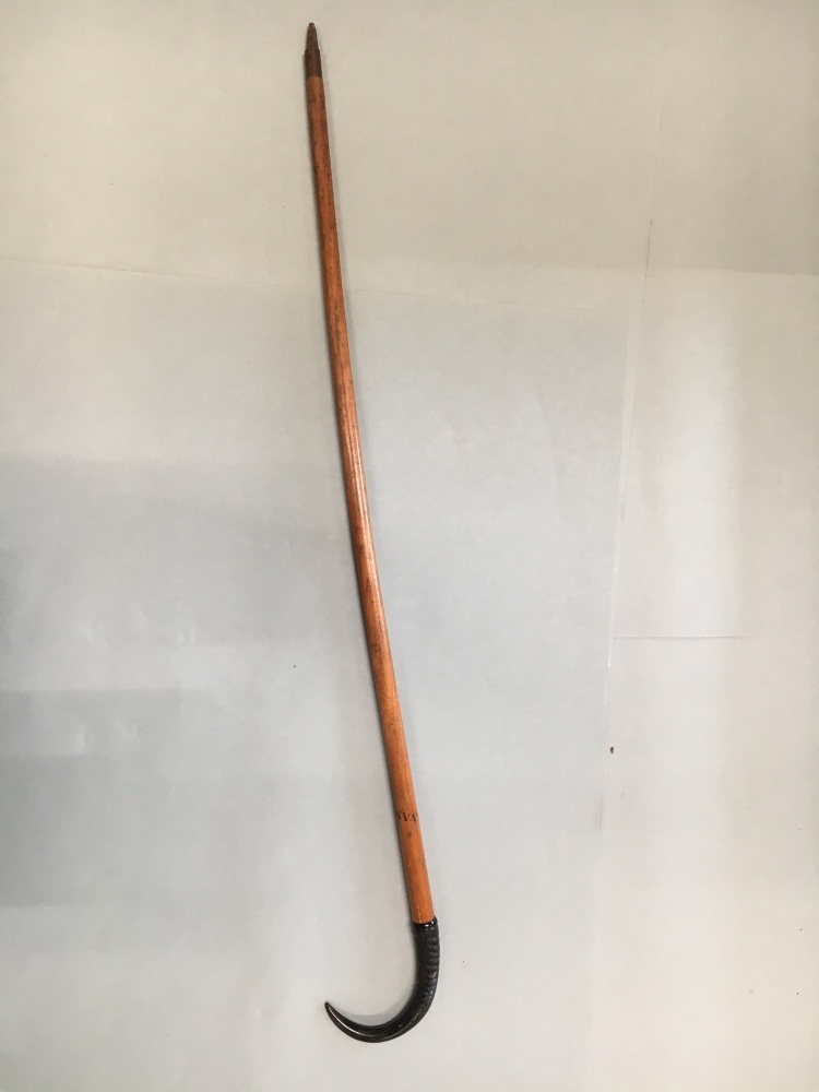 Bergstok met ijzeren punt, als handvat een gemshoorn, opschrift op de stok SALVAN