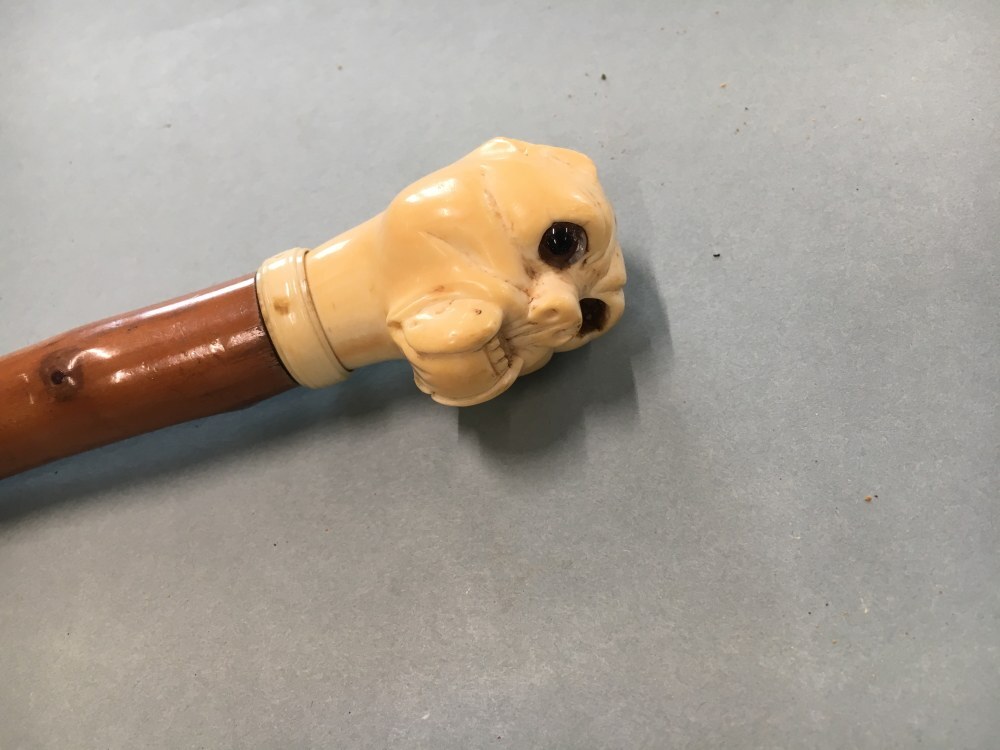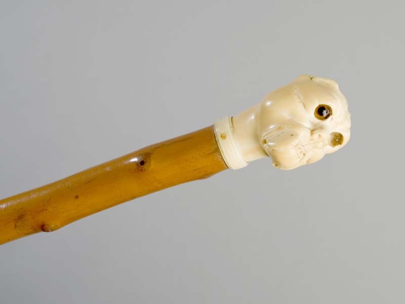 Wandelstok met doornknobbels, de knop bestaat uit een gesneden buldoggenkop