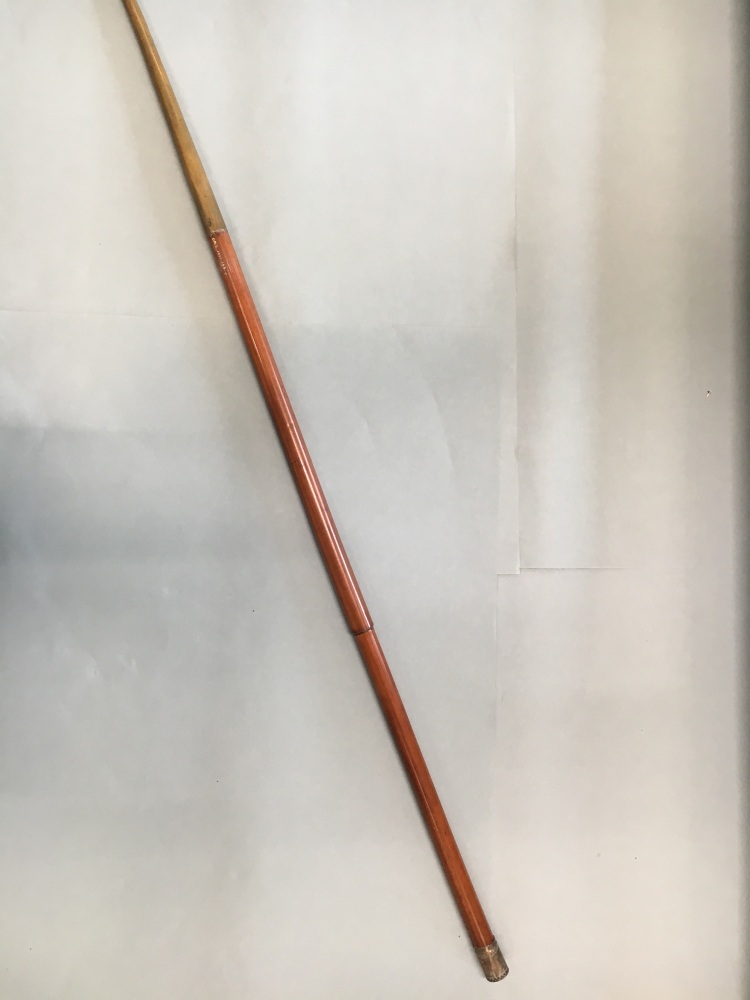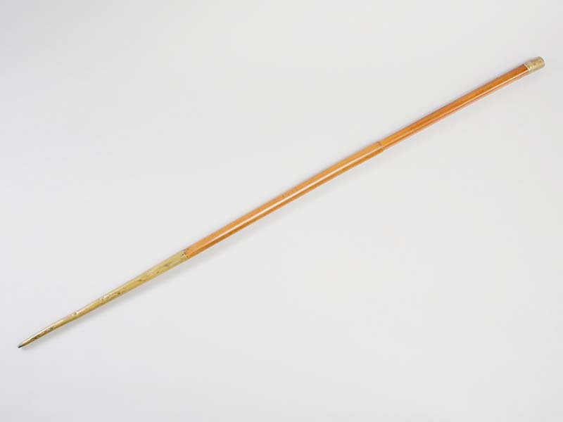 Bamboe wandelstok met grote geel koperen bus op het einde, op de top een gebombeerde koperen bus