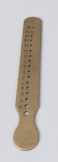 Koperen maat voor het meten van de dikte van de naalden, onderdeel van groep van drie