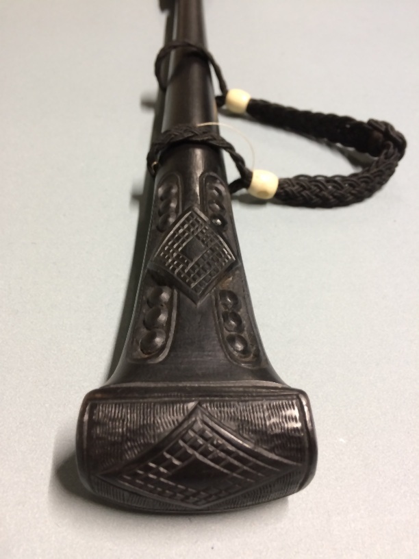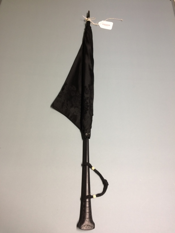 Parasol, overtrokken met zwarte zijde, langs de rand en rond de top gebloemd patroon, de knop enigszins bewerkt