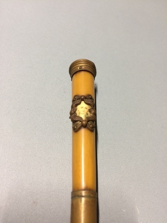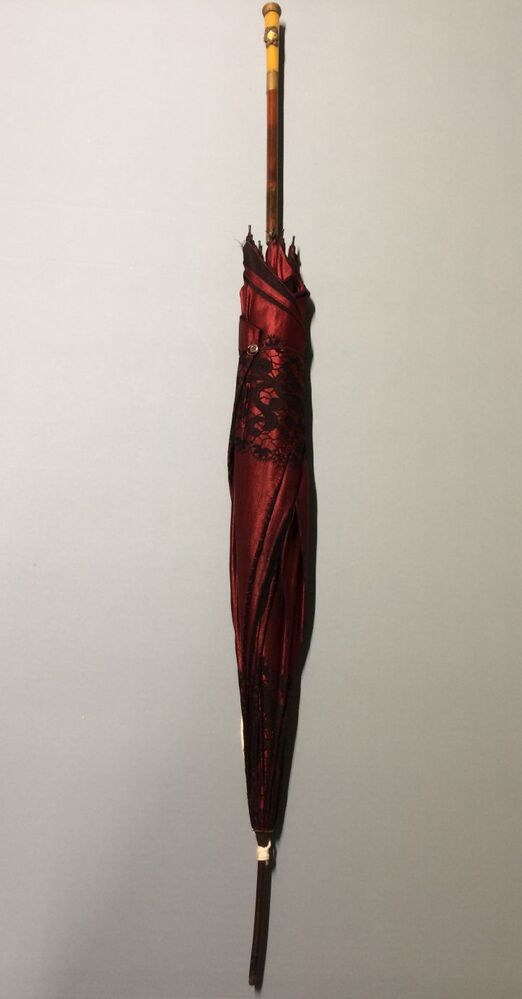 Parasol overtrokken met rode zijde, langs de rand en rond de top in zwarte kleur een bloemrand, benen greep waarop een dameskopje in koperen cartouche