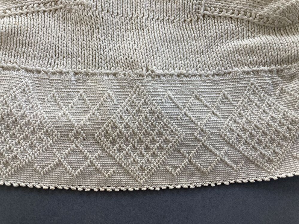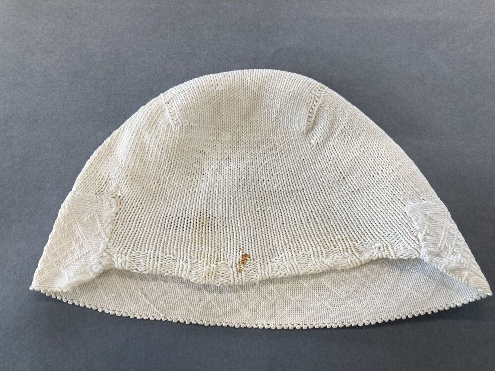 Gebreide wit katoenen ondermuts met gehaakte rand in de nek met reliëfstokjes