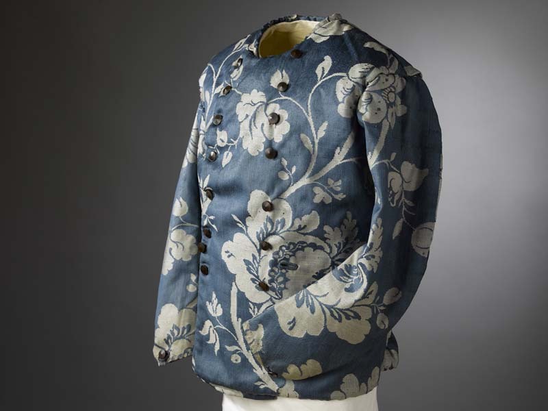 Baeitje van blauwe damast (wol) met ingeweven witte bloemen