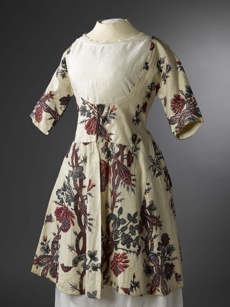 Sitsen vrouwenjak met diepe ronde halsuitsnijding, met groot patroon van om elkaar slingerende ranken met diverse bloemen op witte grond