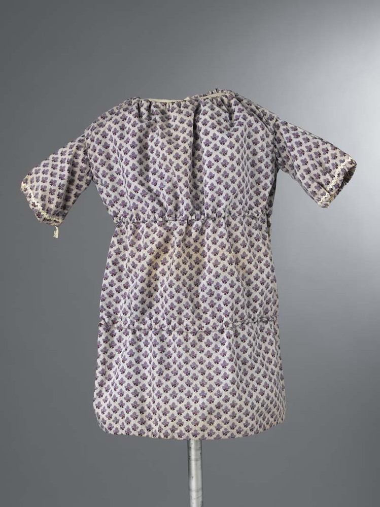 Japonnetje van bedrukte katoen met spikkelgrond en paarse bladmotiefjes