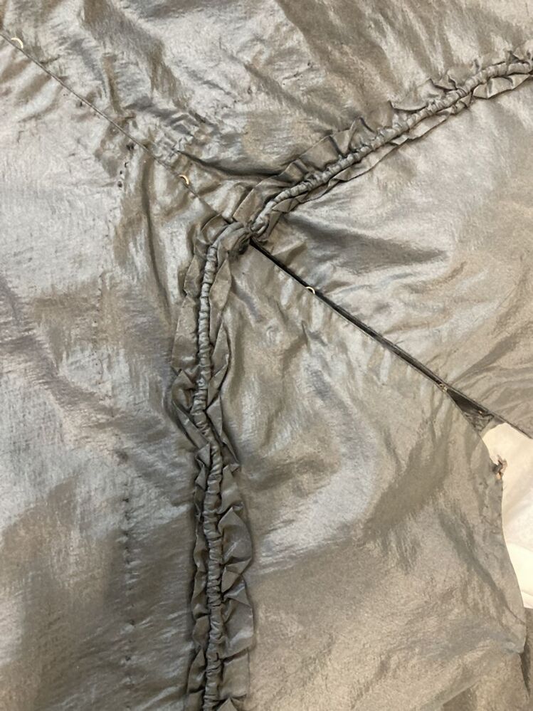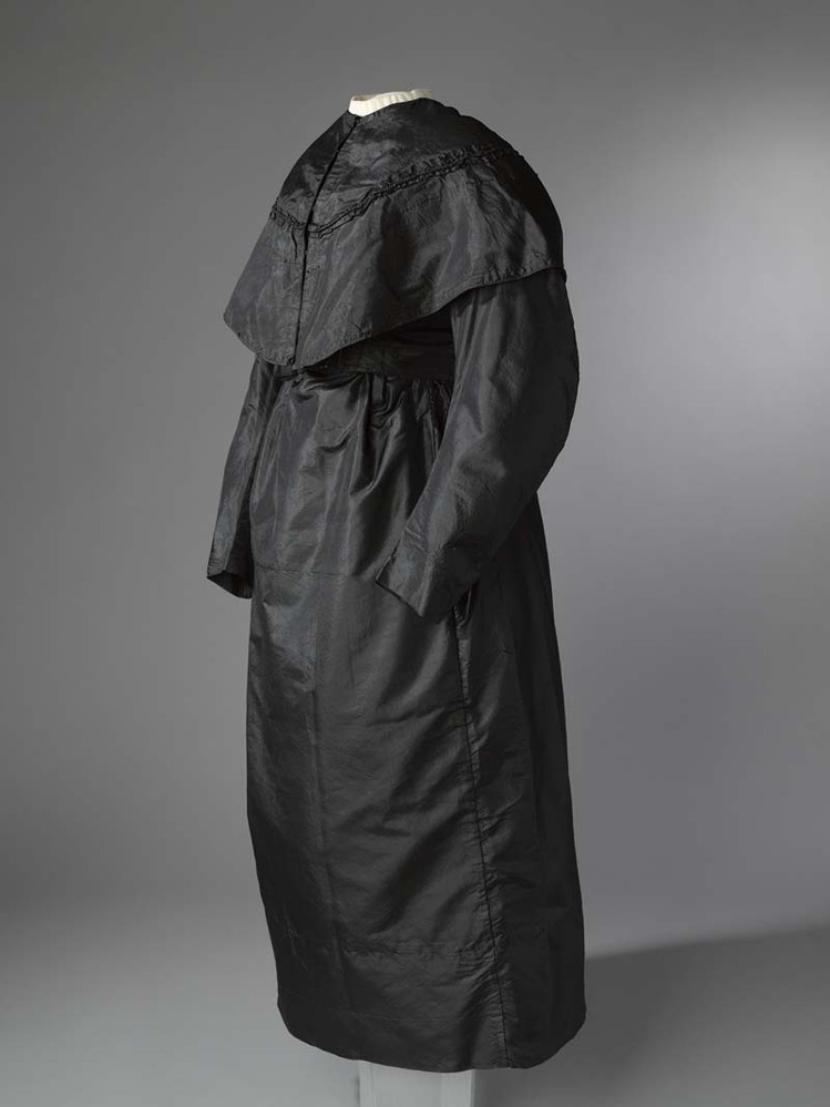 Schouderkraag of pelerine van zwarte zijde met opgenaaide ruche, onderdeel van een 3-delig kostuum, voorts bestaande uit jak en rok