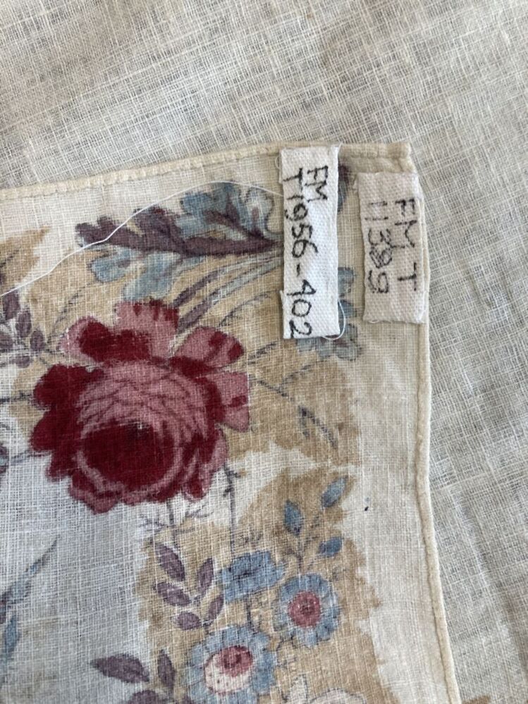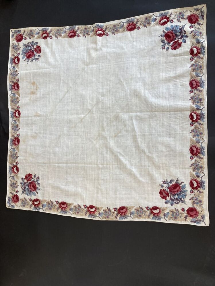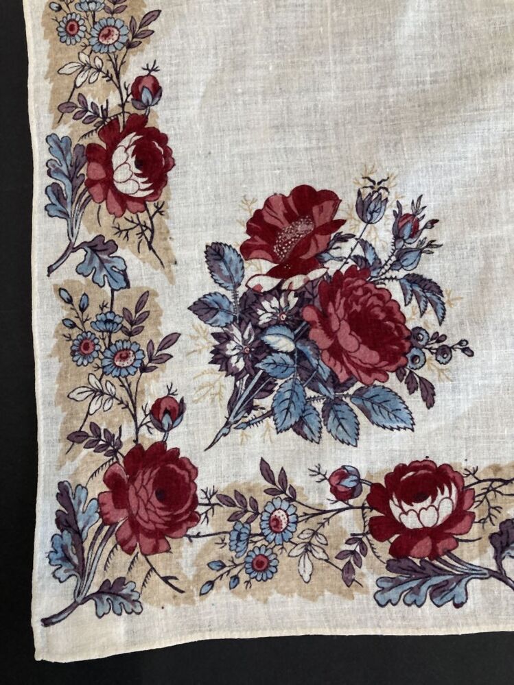 Vierkante doek van bedrukt katoen, rondom gezoomd, rand met naturalistische rozen, in elke hoek roos-hoekmotief