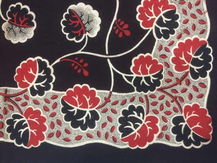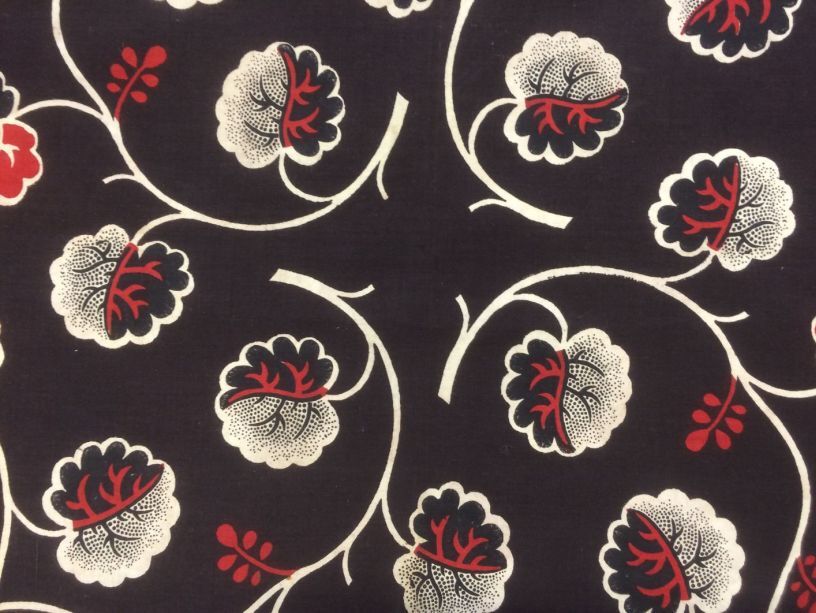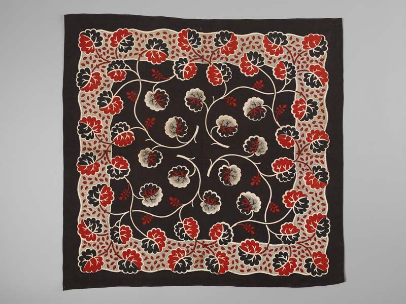 Vierkante bedrukte katoenen doek of sjaal met krullende bladranken op donkerbruin fond en witte rand