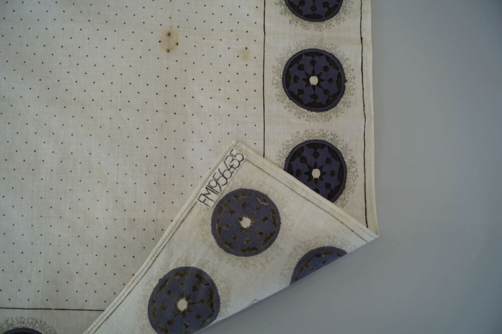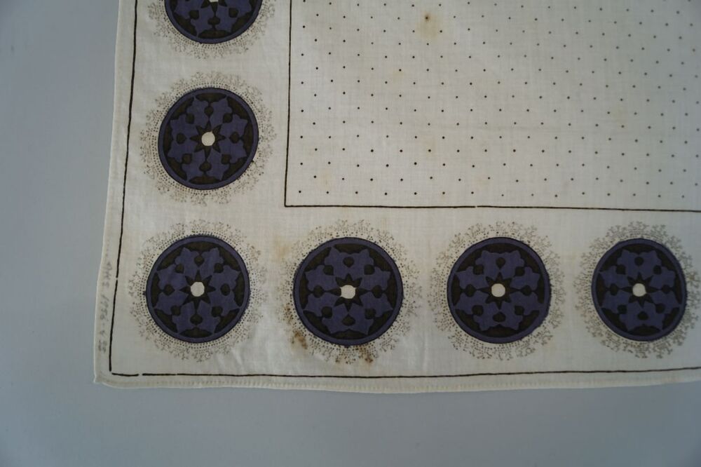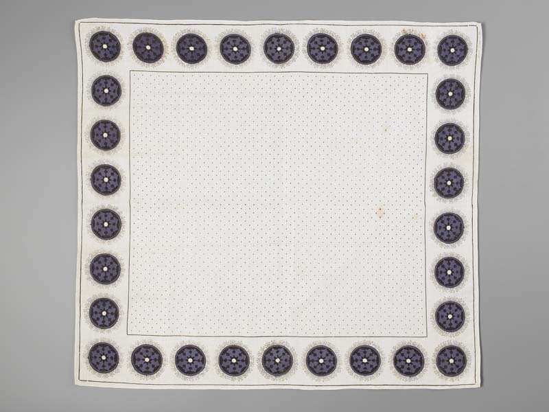 Vierkante bedrukt katoenen doek of sjaal met cirkels in de rand in wit, zwart en blauw