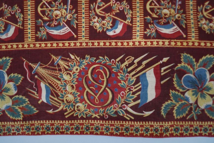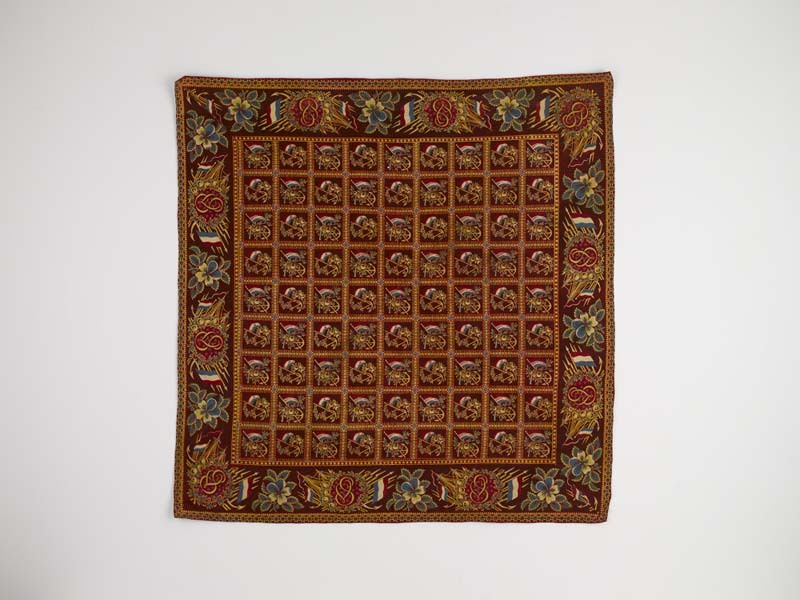 Vierkante veelkleurig bedrukte katoenen doek of sjaal met motief van vlaggen, ankers en scheepsmasten in ruiten, monogram VS in de rand