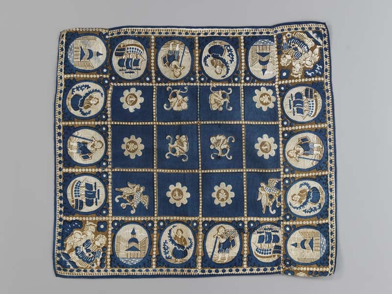 Vierkante bedrukt katoenen doek of sjaal in blauw, wit en bruin met platbinding