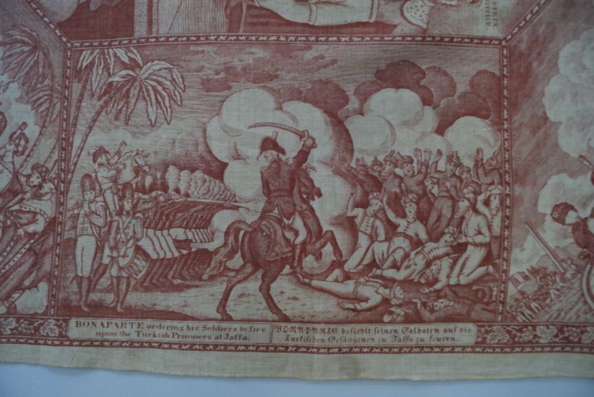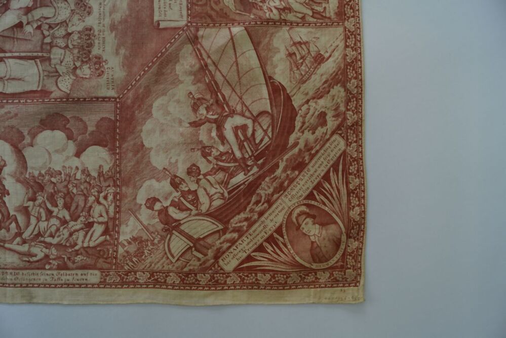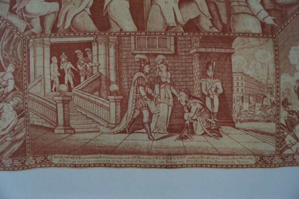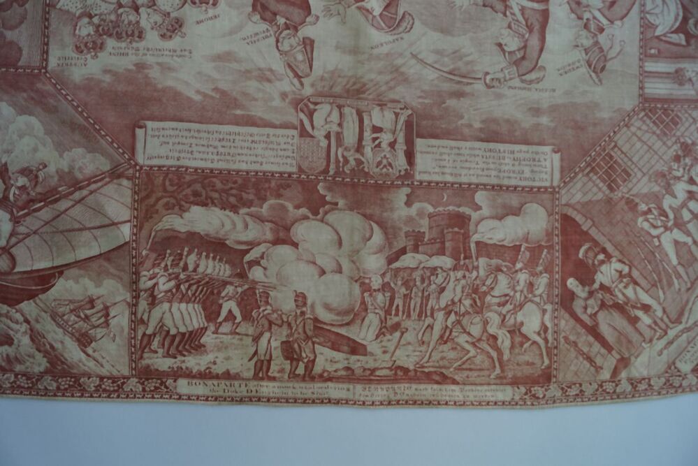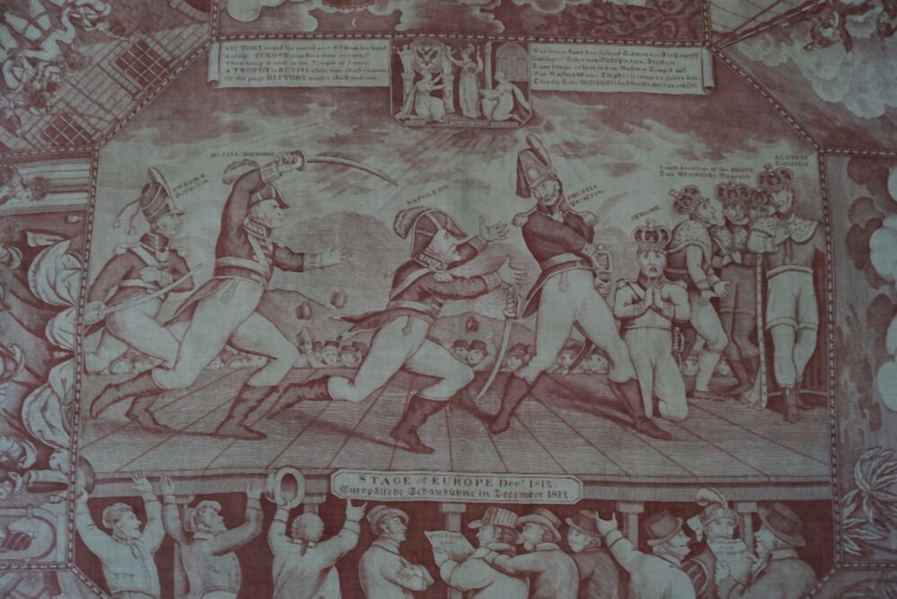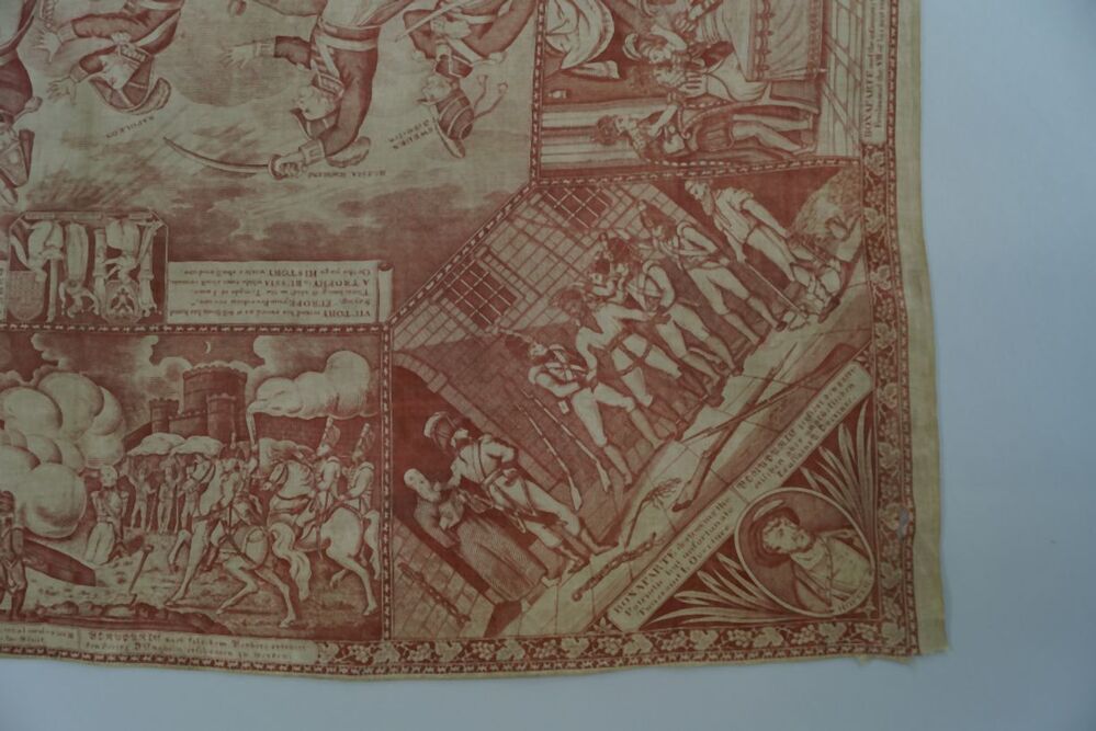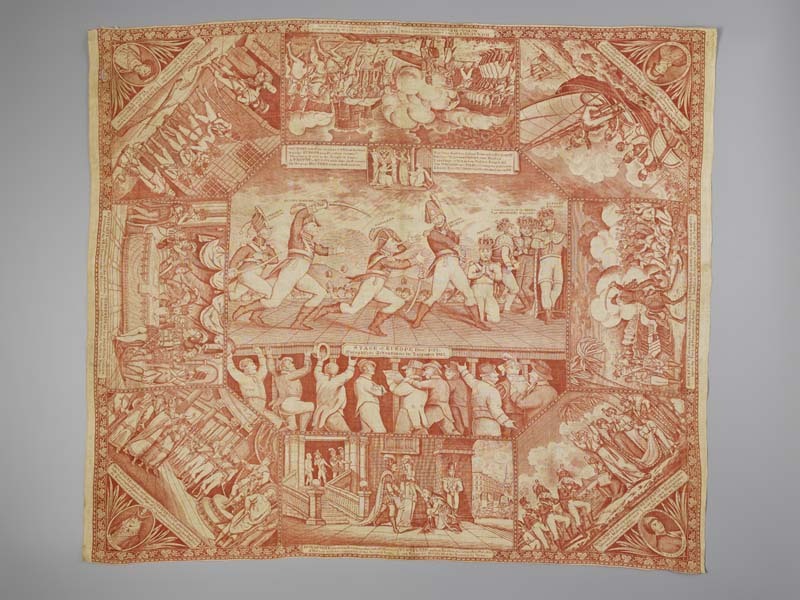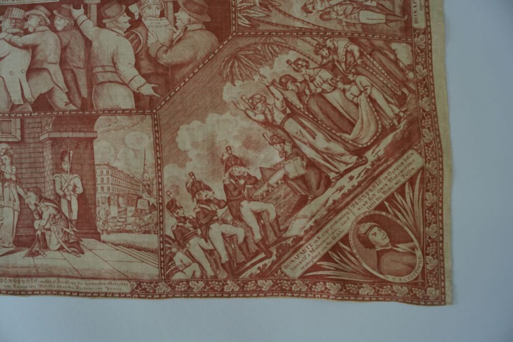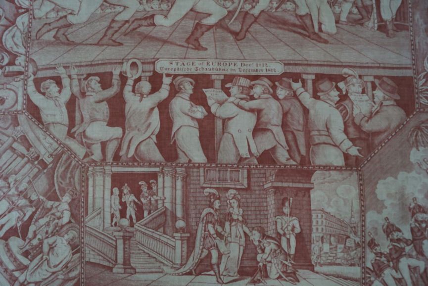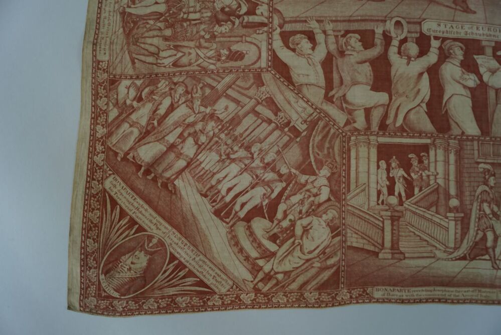 Bedrukte katoenen gedenkdoek met scènes in rood betreffend de STAGE of EUROPA dec. 1812