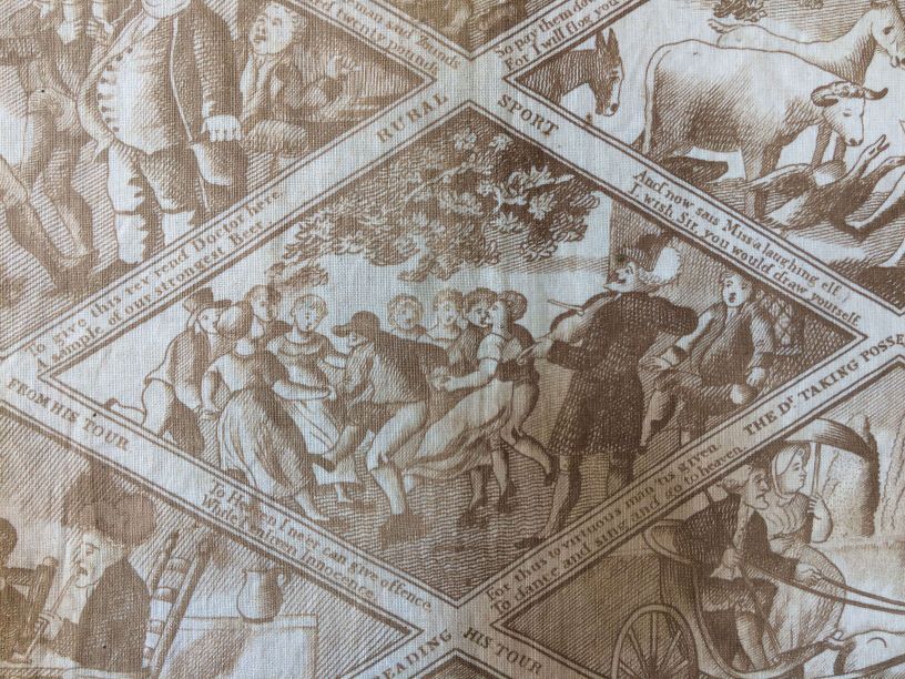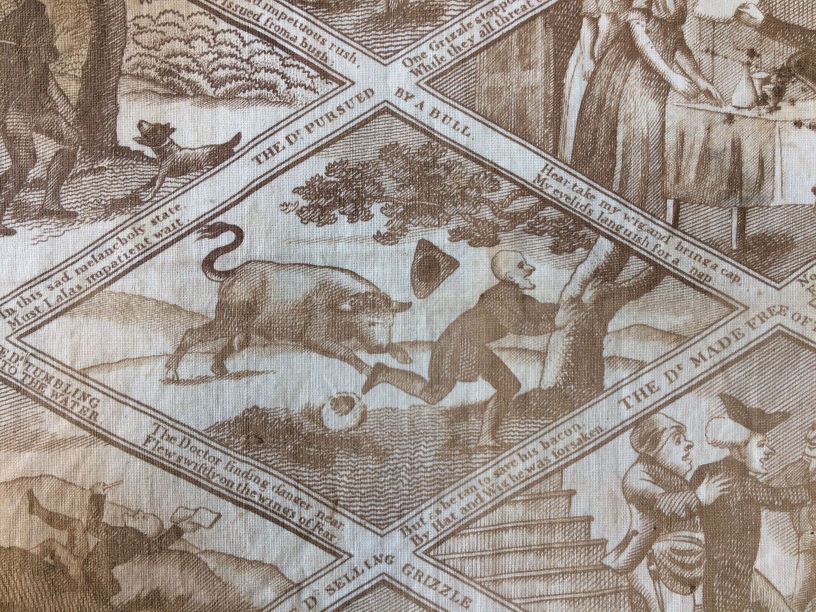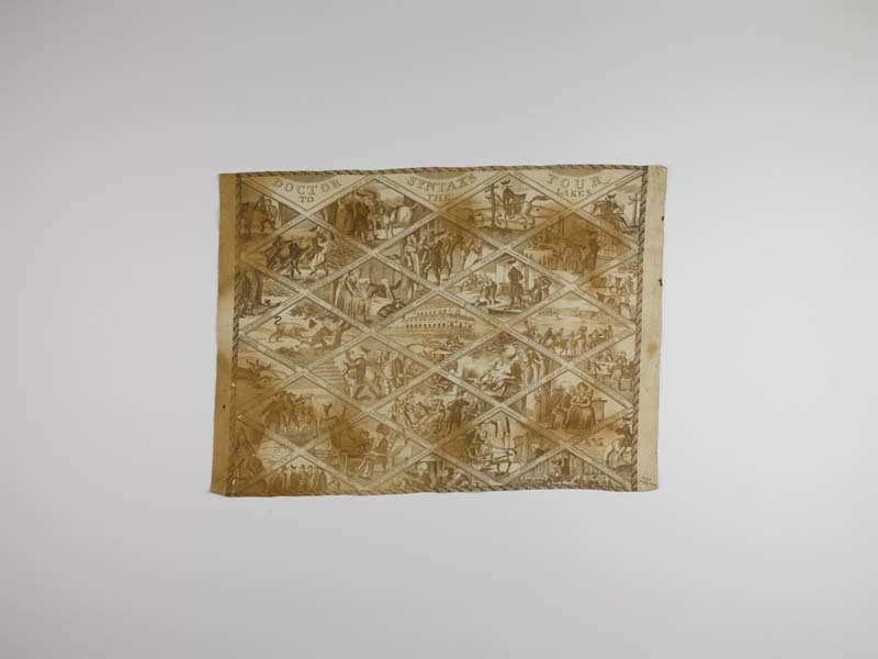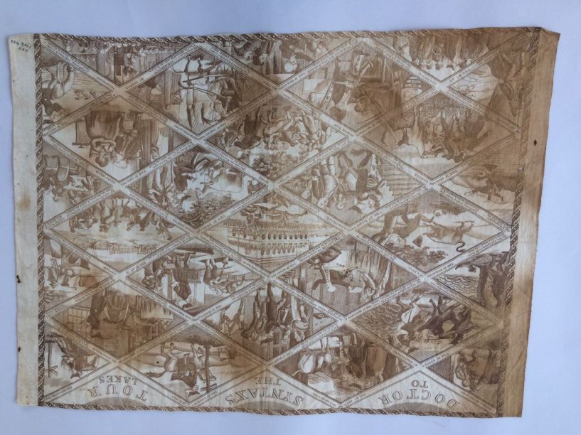 Gedenkdoek van witte katoen bedrukt met bruine ruiten met hierin afbeeldingen van de Doctor Syntax's Tour to the lakes