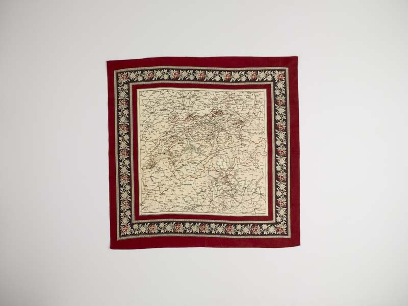 Gedenkdoek van bedrukt katoen in de kleuren wit, zwart en rood met landkaart van Zwitserland
